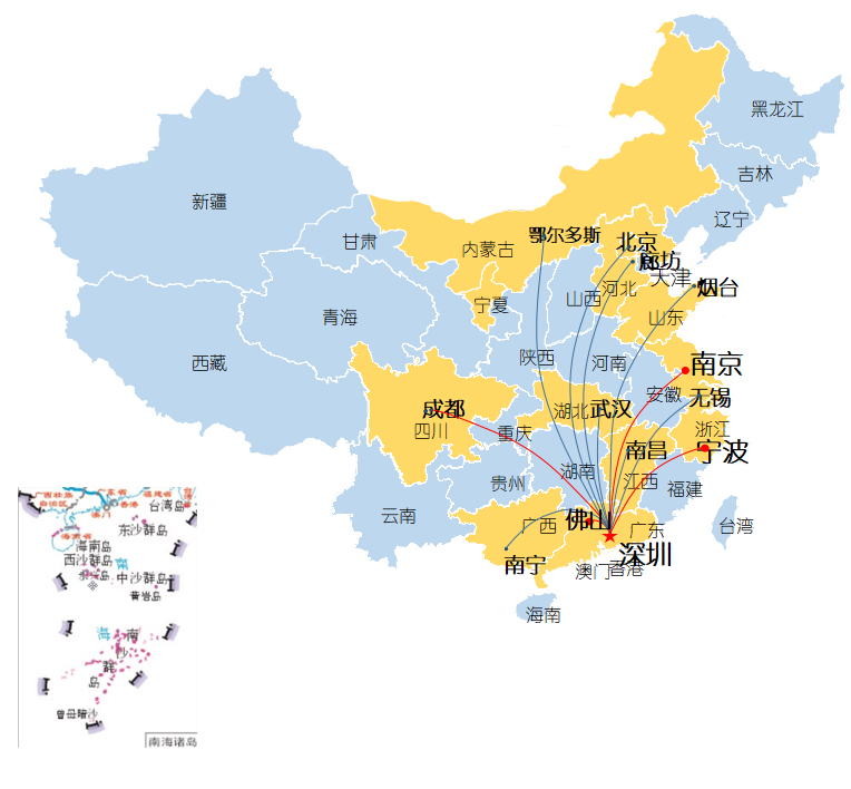 以深圳為總部,設置了南海,寧波,南京,無(wú)錫,成都等辦事處,銷(xiāo)售區域輻射華南,華東,華中,西南,直至覆蓋全國范圍